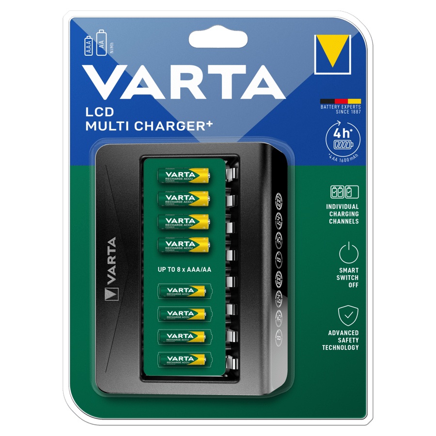 Мулти зарядното LCD устройство на Varta е идеалното решение за зареждане на до 8 батерии от тип АА или ААА едновременно. То разполага с LCD дисплей, който показва текущия заряд на всяка батерия и състоянието на зареждане.